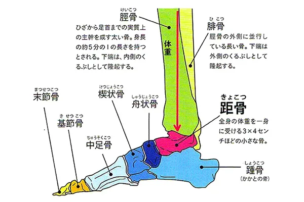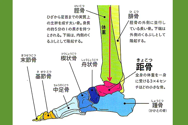 「距骨」とは、かかとの骨の上に位置する、わずか3×4cmほどの小さな骨です。この小さな骨は、長くて太い「脛骨(けいこつ)」と平行に存在する「腓骨(ひこつ)」を支え、全身の体重を受け持つ重要な役割を果たしています。そのため、身体のゆがみに対して大きな影響力を持っているのです。